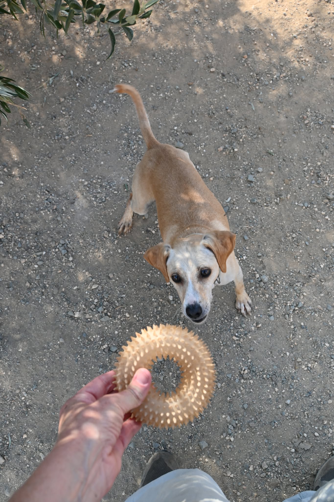 Christiana lives at Constantina’s house and happily lives with dogs of all shapes and sizes. We use her for dog tests and she will also happily hang out with our more nervous resident dogs at the Sanctuary.