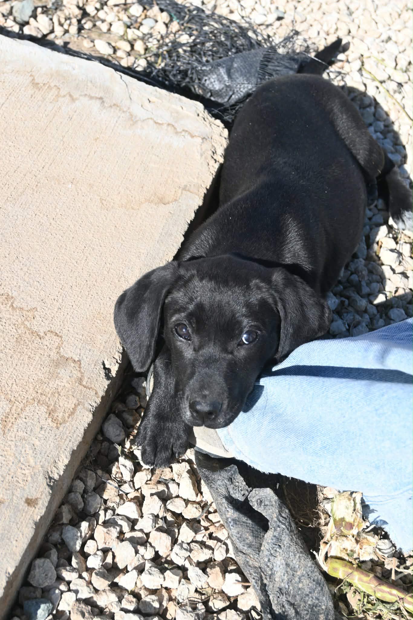 We don’t know what breed mix Olive is although it’s likely that there is some pointer in the mix. She’s also still too young to be able to estimate how big she’ll get. What we can say is that she’s gorgeous and friendly and sweet and fun!